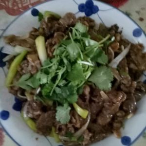 热锅下油,油八成热后倒入拌好的羊肉,羊肉变焦黄色后倒入剩下的葱丝翻炒出锅,撒上香菜!