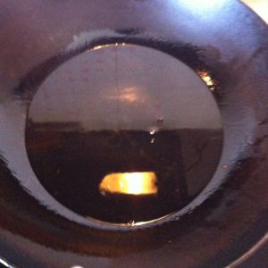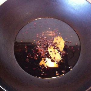 锅中放入植物油,油一定要多些。油不用热就放入花椒和八角、香叶,开小火,慢慢炸出香味。