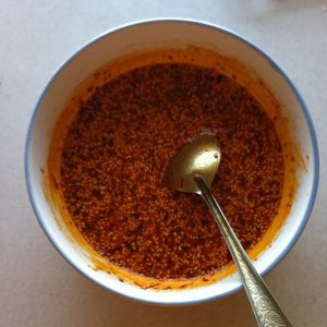 粗辣椒面、细辣椒面加少许盐拌匀放在碗里备用。
