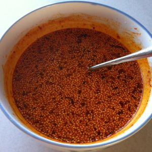 然后迅速用一个大勺把拌好的辣椒面一勺一勺倒入芝麻油中,一边倒一边搅匀,以防辣椒会糊。