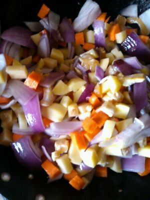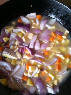 翻炒片刻 加入水 没过食材 煮沸后 调成中火 再煮十分钟