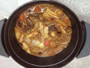 羊肉炖煮一小时左右感觉肉比较烂后再加小碗开水,冰糖适量,如觉得不够咸还可加少盐,水开后加入胡萝卜、山药、腐竹,炖煮约二十分钟后加入白菜,盖锅继续煮,五分钟后开锅翻炒一下,白菜煮烂即可关火