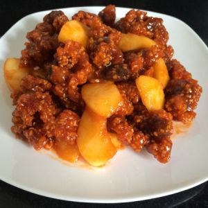 炒制:1.起炉灶,空锅放色拉油,4-5层热,倒入清水半碗,并加入白糖3汤勺,翻炒一下;2.白糖化开后,稍微冒泡转小火,下入苹果进行翻炒;3.翻炒均匀时倒入适量的番茄酱翻炒均匀;4.倒入熟排骨,翻炒均匀,大火收汁;
