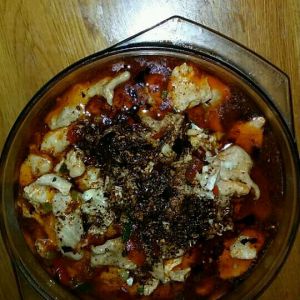 把肉捞起放到码好青菜的容器中,然后把锅中的汤也倒入容器中,接着把之前擀好的花椒辣椒面撒在肉片上,在撒点蒜末,最后在上面浇上热油,完成。