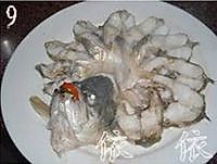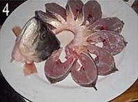 4. 切好的鱼肉打开,一片片整理成扇形,鱼头竖着摆放在靠近鱼肚这边