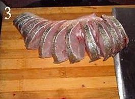 3. 鱼身部分从鱼背垂直下刀,用左手拍下,切成均匀的厚片,鱼腹部位不要切断,要连在一起的