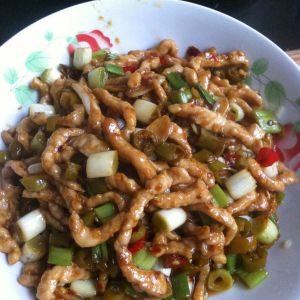 锅里放油,先把肉丝炒到七成熟起锅(这样是为了防止肉丝炒的时间过长变老)放入姜蒜炒香,再放入泡椒和郫县豆瓣继续炒一分钟.再放入大葱翻炒然后倒入肉丝炒匀,最后倒入调好的糖醋汁翻炒均匀即可出锅.