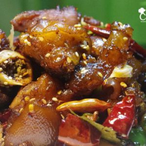 刨开猪脚到一边,利用锅中余油将配料炒出香味