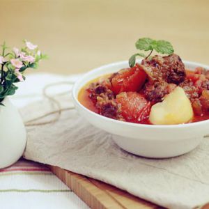 最后将番茄和土豆块一起倒入已经焖煮一个小时的牛腩锅里,继续再煮约一个小时,用盐调味,即可!