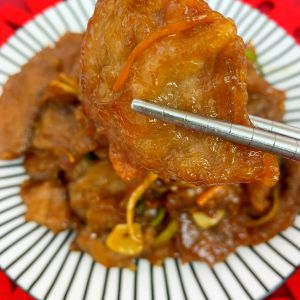 锅底少量热炒油,葱姜丝、胡萝卜丝、香菜、料酒、糖、酱油、醋、翻炒;再加入过好油的肉片翻炒挂汁。