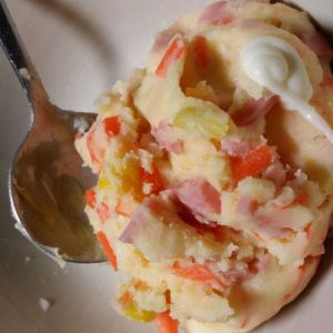 混合热油和蛋黄,加入土豆泥,玉米粒,火腿粒,胡萝卜粒,加入调料和沙拉酱,抓匀就好了,沙拉酱可以多点。