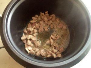 在电饭煲内加入少许油,将羊肉丁放入翻炒,加入料酒,生抽少许,胡椒粉,盐,待翻炒变色