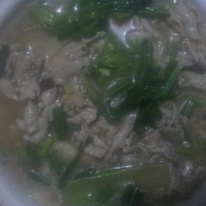 3.锅内放入适量油,放入姜,蒜,辣椒,豆瓣酱煸炒,倒入水,等水开后放入肉片,生菜煮1,2分钟即可出锅倒入碗内