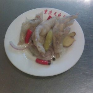 洋葱切丝,芹菜切段。生姜切片。小米椒切段。加入盆里盐,味精,鸡精,白醋,麻辣,和泡爪盆里 加入清水莫过鸡爪就好,