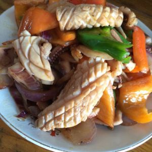 鱿鱼切花刀炒水,再爆炒,炒水时记得加料酒去腥喔