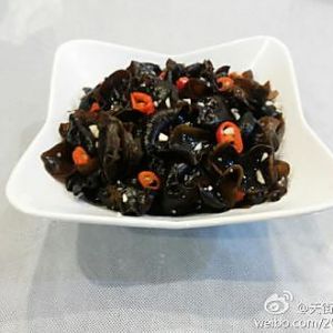 大蒜用压蒜器压成泥,与红尖椒混合在一起,倒入木耳中。