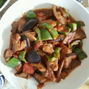 放入待用的茄子柿子椒片,同时加入余下的番茄块,翻炒至番茄糊均匀的挂住茄子和柿子椒片上,注意,要保持番茄的外型完整,在番茄被炒散之前,出锅完成