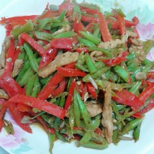 油锅烧热后依次放入瘦肉、四季豆、红柿子椒翻炒,调味,即可起锅。