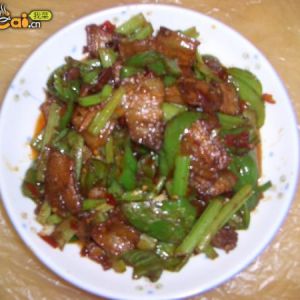 放入切好的青椒和芹菜翻炒,要起锅时再放入少许葱。