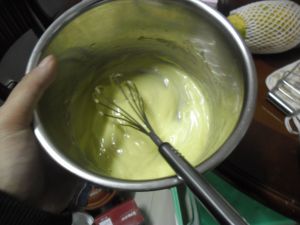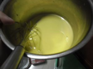 先加入两、三汤匙玉米油,搅打均匀后混合物颜色会变淡,质地变稠。