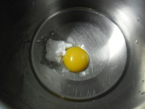 鸡蛋取蛋黄,放入大一点的容器(方便搅打),加入糖,盐,用手动打蛋器搅拌均匀。