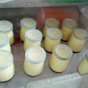 烤箱160度预热十分钟左右,烤盘加入五十度左右的热水,高度两厘米淹没瓶底。玻璃瓶放上烤盘入烤箱一百六十度烤制三十分钟。液体凝固,用力摇晃瓶子不流动轻微抖动说明烘烤成功。