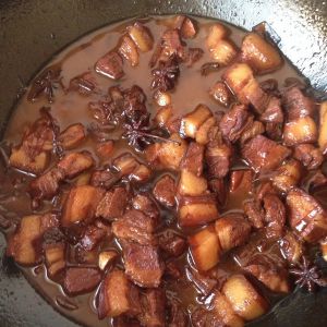 扁一下肉,尽量时间久些,那样肉里的油就没那么多,加水刚刚没过肉就好