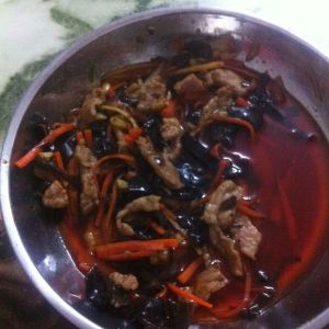 将肉放入油锅翻炒变色盛出,锅里放油将蒜末姜丝爆香,放入黑木耳和胡萝卜翻炒,加盐调味。等差不多好了放入肉一起翻炒。加酱油、老干妈,味精调味即可装盘