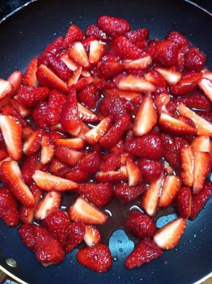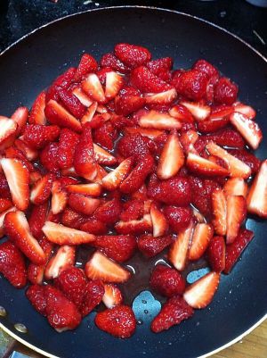 把草莓根部去掉,切成如上图形状,放入不粘锅中备用,再放入三大勺白砂糖,腌制半个小时出汁