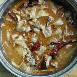 高汤加热翻涨,倒入辣椒油,再放入翻炒过的辅料,一两分钟后倒入猪肉,三十秒后关火,滑嫩可口!