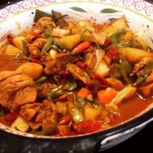 放盐,蚝油、五香粉、用筷子戳鸡肉可以戳透以后,把其余土豆、萝卜、青椒、洋葱按熟的顺序放入锅里,土豆半熟以后大火开始收汁。