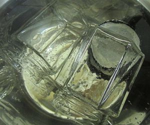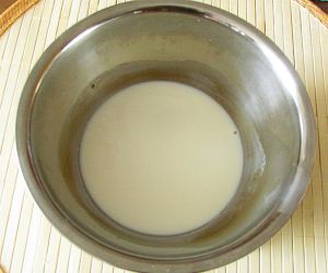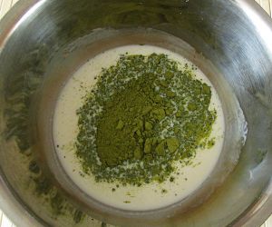 将抹茶粉倒入牛奶中,拌匀没有一点颗粒.将拌匀的抹茶牛奶混合液放到一边备用.