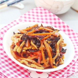 里脊肉切丝,加淀粉,料酒腌制10分钟。干木耳泡发后洗净切丝。胡萝卜切丝,红椒切丝。