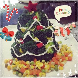 然后把西兰花从下往上插进土豆泥里做成树状,不要用空隙,把黄色红色的彩椒切成三角和方的小丁,放在西兰花上当圣诞树的点缀,刻一个比较大的五角星用牙签插在顶部做装饰。把剩余的玉米青豆胡萝卜粒铺在树周边~最后用色拉酱涂成彩带状就好了
