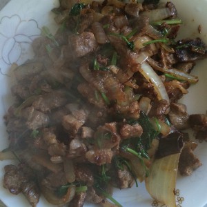 锅中倒油 油热后放孜然粒适量进行翻炒 炒出香味后放入腌好的羊肉粒炒至八成熟后 放切好的葱姜 花椒大料 红辣椒炒出香味 放剩下的洋葱 香菜 炒到熟。
