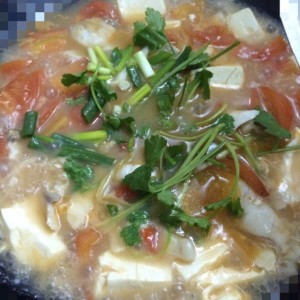 番茄切丁 豆腐切块 香菜洗净备用。鱼切片 放淀粉 胡椒粉 料酒 一起拌5分钟