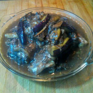 蓄水调盐糖酱油醋,开锅两分钟后放茄子,盖盖烧八分钟,收汁即可出锅盛盘。