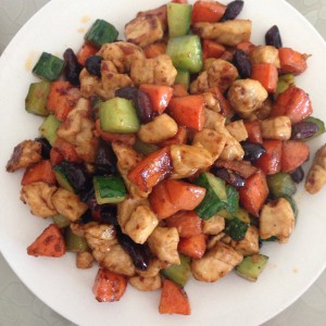 炒菜过程 没来得及拍照 在这里说一下吧 锅热先下胡萝卜 不爱熟先炒炒 放入鸡丁翻炒变色就熟了 放入黄瓜丁 法宝是红99底料 放一块 翻炒几下 放点盐 放入花生仁 出锅喽 第一次做 味道还不错