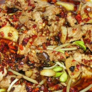 锅中倒入油,放入姜,辣椒酱,花椒自己干辣椒炒出香味,然后放入里脊肉大火炒熟。