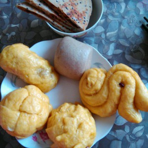 我还做了刺猬包,兔子造型包,绣球包,黑色的是豆腐渣馒头,早上磨豆浆滤出的豆腐渣,黑色是加了核桃仁的原因。