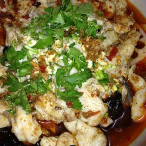 全部食材煮好后装盘,将蒜,豆瓣酱,花椒炒出的红油淋上。