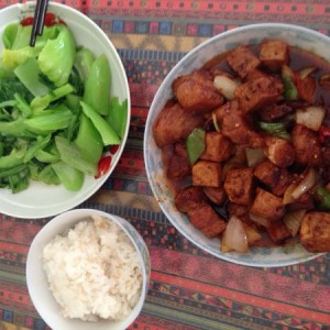 这顿饭很解馋,但其实没有多少肉,豆腐吃在嘴里也像肉,鹌鹑蛋就更好吃了,余油都被洋葱和青椒吸走,也没多少了,再配一盘清炒芥蓝,周末午餐基本圆满!