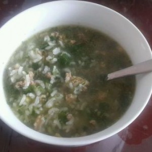 米煮开花后放鸡肉和雷公根煮熟,调味,就可以了!!