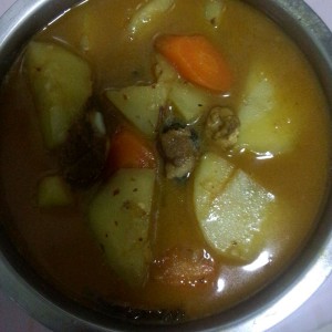 腌制好的排骨倒入油锅内翻炒,倒入适量的水煮至五分熟后,倒入土豆胡萝卜,大火烧10分钟,转小火至土豆熟,即可。