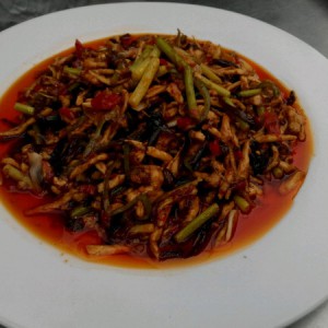 锅中放入油,油温不能过高,放入剁好的泡椒和豆瓣酱,炒香,放入胡萝卜丝,土豆丝,蒜苔,木耳,炒制八成熟,放入肉丝。翻炒均匀,放入盐,糖适量,醋适量。翻炒均匀,出锅,动筷!!