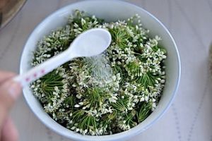 将韭菜花择干净,去除不好的发黄的,然后将发倒入清水中浸泡15分钟(最好加点盐在水中,这样可以消毒杀菌)