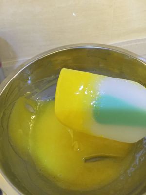 拿一个大点的容器架在锅上,加入黄油块+蛋黄+细砂糖+盐,隔水加热。加热到细砂糖,盐和黄油块融化,并且变得粘稠~当你用刮刀挑起混合物,会有一层厚的液体挂在上面就ok了