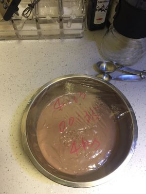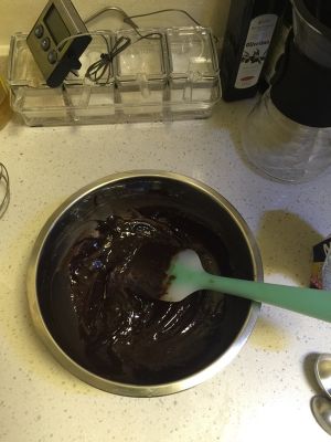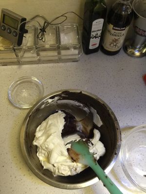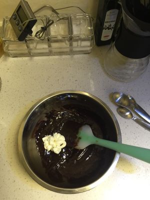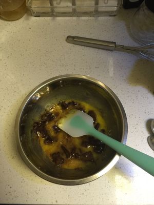 去火,将黑巧克力碎放入蛋黄混合物,用余温融化。如果像我一样没切很碎融化不了的话就,就继续放回锅里,用水的余温融化