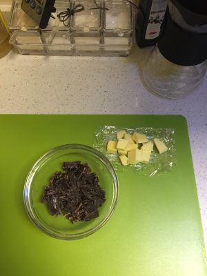 把巧克力切碎,放置备用~我用的是德芙黑巧克力,可可含量是66%,或者你也可以隔热水加热至巧克力融化,这样比较好混合