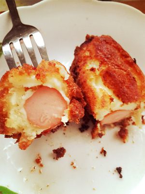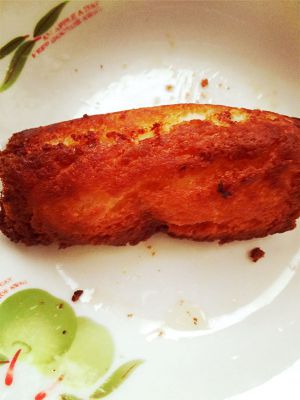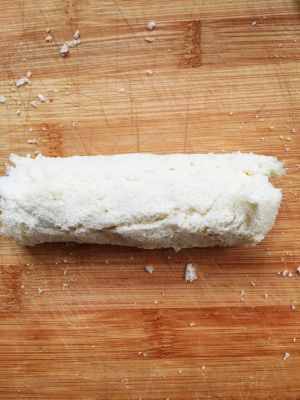 吐司有点时间长了,卷得不好看,将就一下哈,反正一会儿就到肚子里了……卷吐司片时用手捏一捏,它就粘上去了,不要怕它碎掉。卷好后裹上面包糠,我用完了,下次再做的时候补图